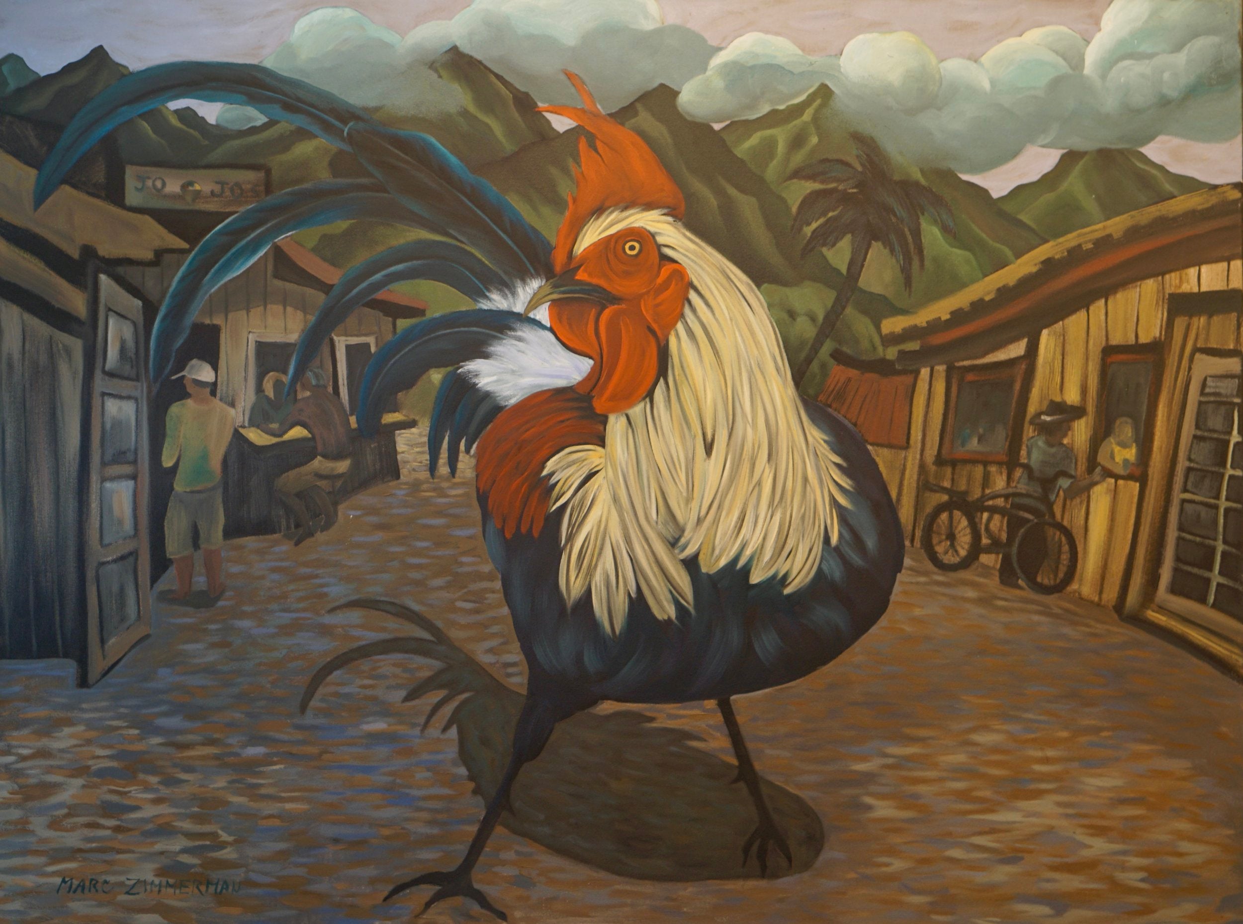 This intimidating rooster challenges all who walk this way. Big and bold……. and beautiful! Oil on Canvas 36” x 48”