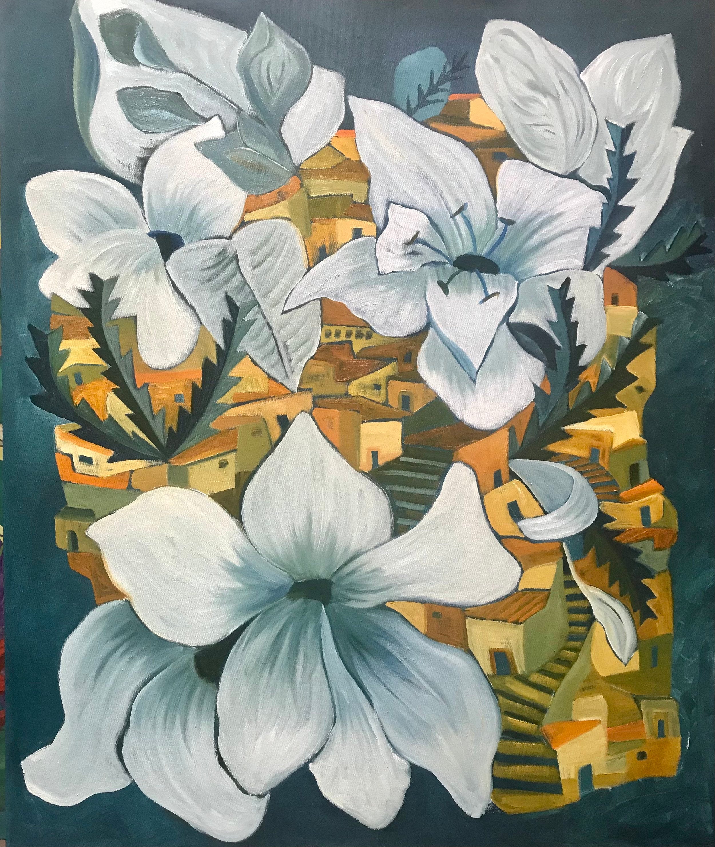 Exaggerated cool white flowers contrasted against the warm village makes for a voluptuous painting. Oil on Canvas 36 x 30"